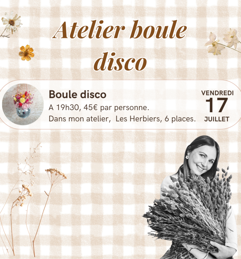 Vous souhaitez participer à un atelier sans occasion particulière ? Je vous propose plusieurs rendez-vous créatifs tout au long de l'année dans mon atelier. Que vous soyez débutant ou passionné, ces sessions vous permettront d'explorer votre créativité tout en apprenant à réaliser de magnifiques créations en fleurs séchées et stabilisées. Rejoignez-moi pour une expérience enrichissante où vous pourrez partager votre passion et découvrir les techniques, le tout dans une ambiance conviviale.