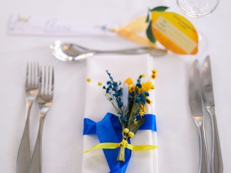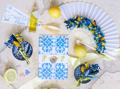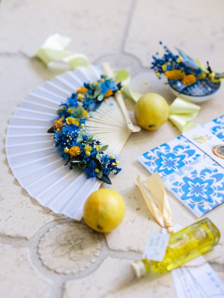 Pour ce mariage célébré en mai dernier, j’ai imaginé des accessoires fleuris aux couleurs jaune et bleu, en écho à l’esprit Dolce Vita.