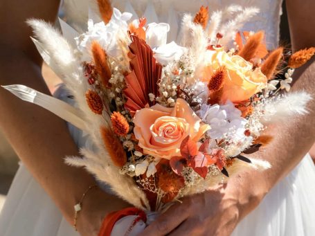 Les fleurs séchées et stabilisées révèlent toute la richesse de cette palette chaleureuse, offrant une création intemporelle, pensée pour accompagner Pauline bien au-delà du jour J.