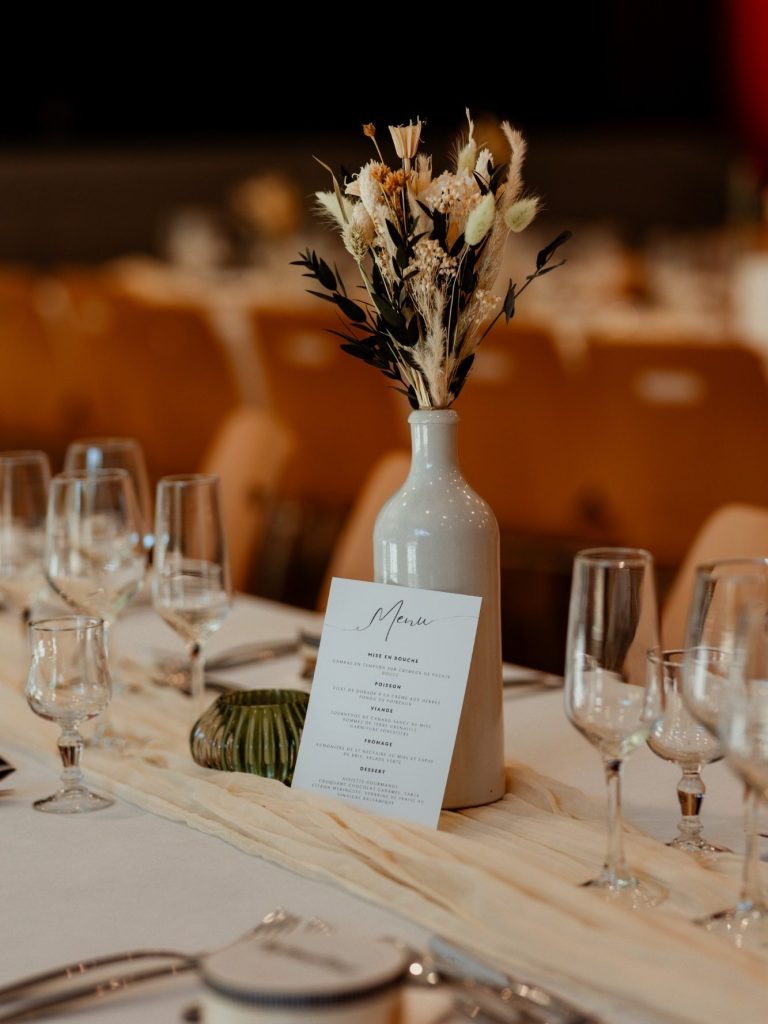 Fleurissement des tables, apportant une touche végétale douce et poétique à la réception