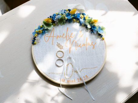 Pour célébrer l’union d’Adeline et Maxime, j’ai imaginé une parenthèse florale délicate, portée par des teintes de bleu, de blanc et de doré.